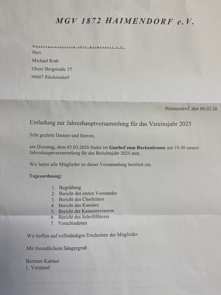 Einladung zur Jahrshauptversammlung für das Vereinsjahr 2025 am 03.03.26 um 19:30 Uhr